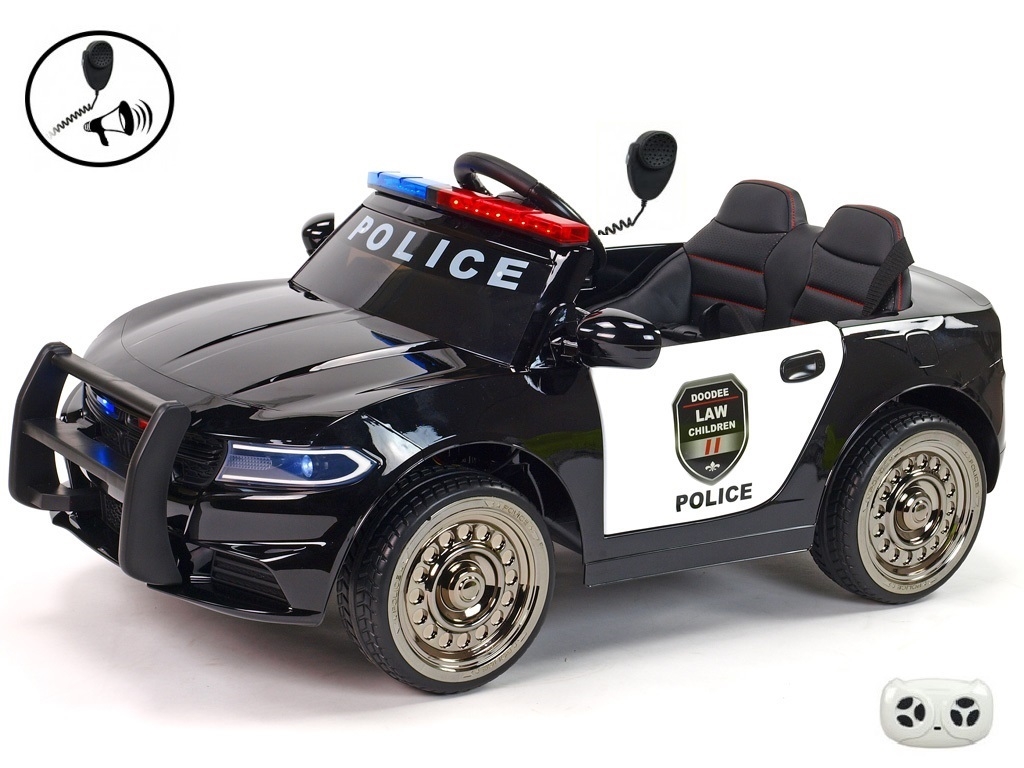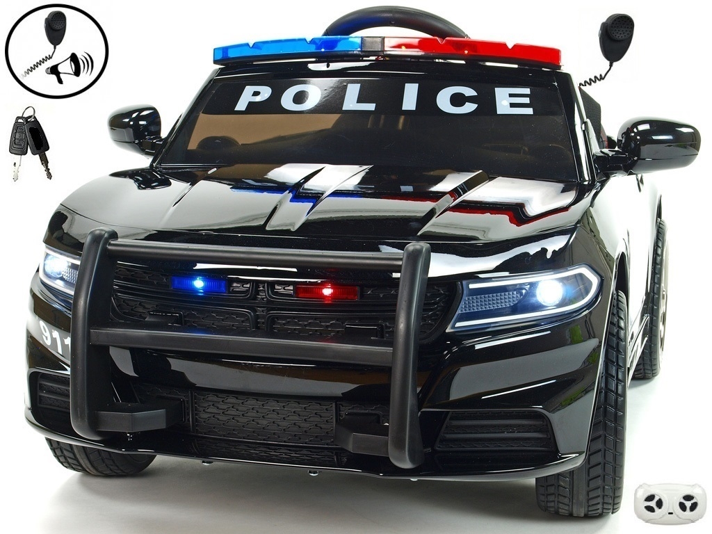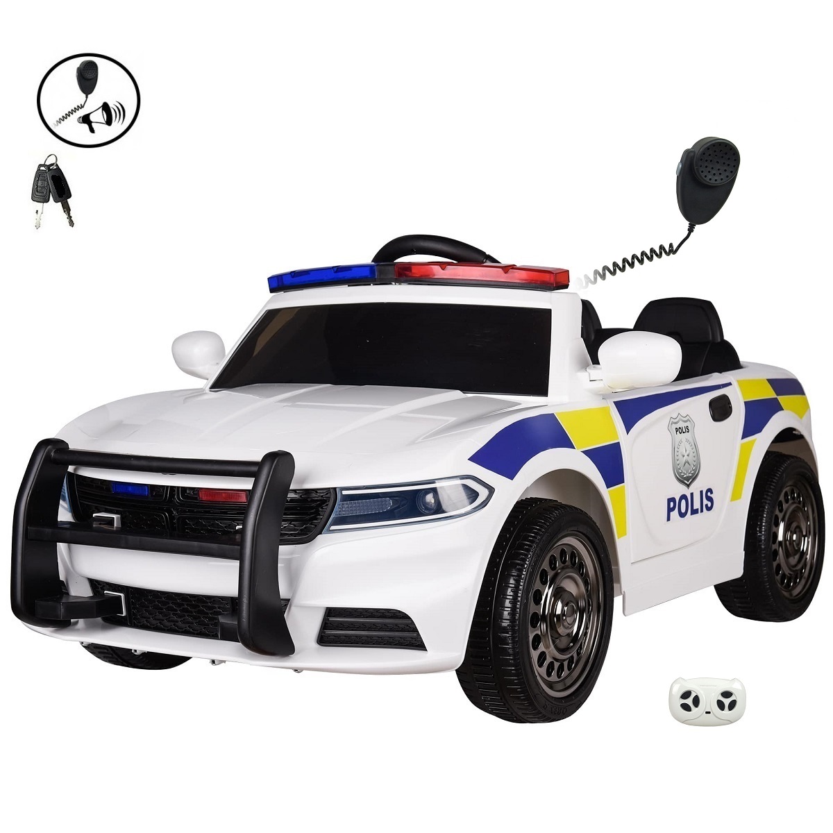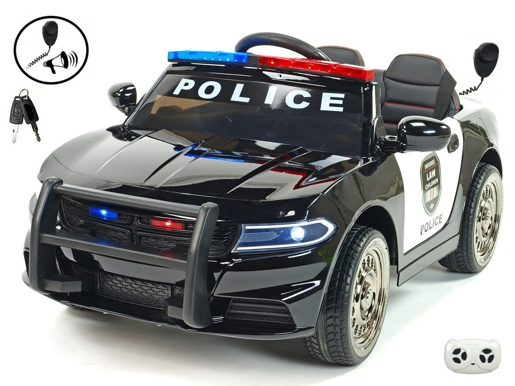 Elektrické policejní auto POLIS je vybaveno 2,4G dálkovým ovládáním, megafonem, policejními LED a zvukovými efekty. Má bílou spínací skříňku, start auta klíčem a přiložen je i 1 náhradní klíč. Obsahuje audio přehrávač, USB a AUX vstup, možnost přehrávání hudby, voltmetr pro stav nabití baterie a zvuky startu motorů, jízdy a klaksonu. Policejní siréna je neodmyslitelnou součástí, stejně jako osvětlení přístrojové desky, policejní majáky a přední a zadní LED světla s možností vypnutí.