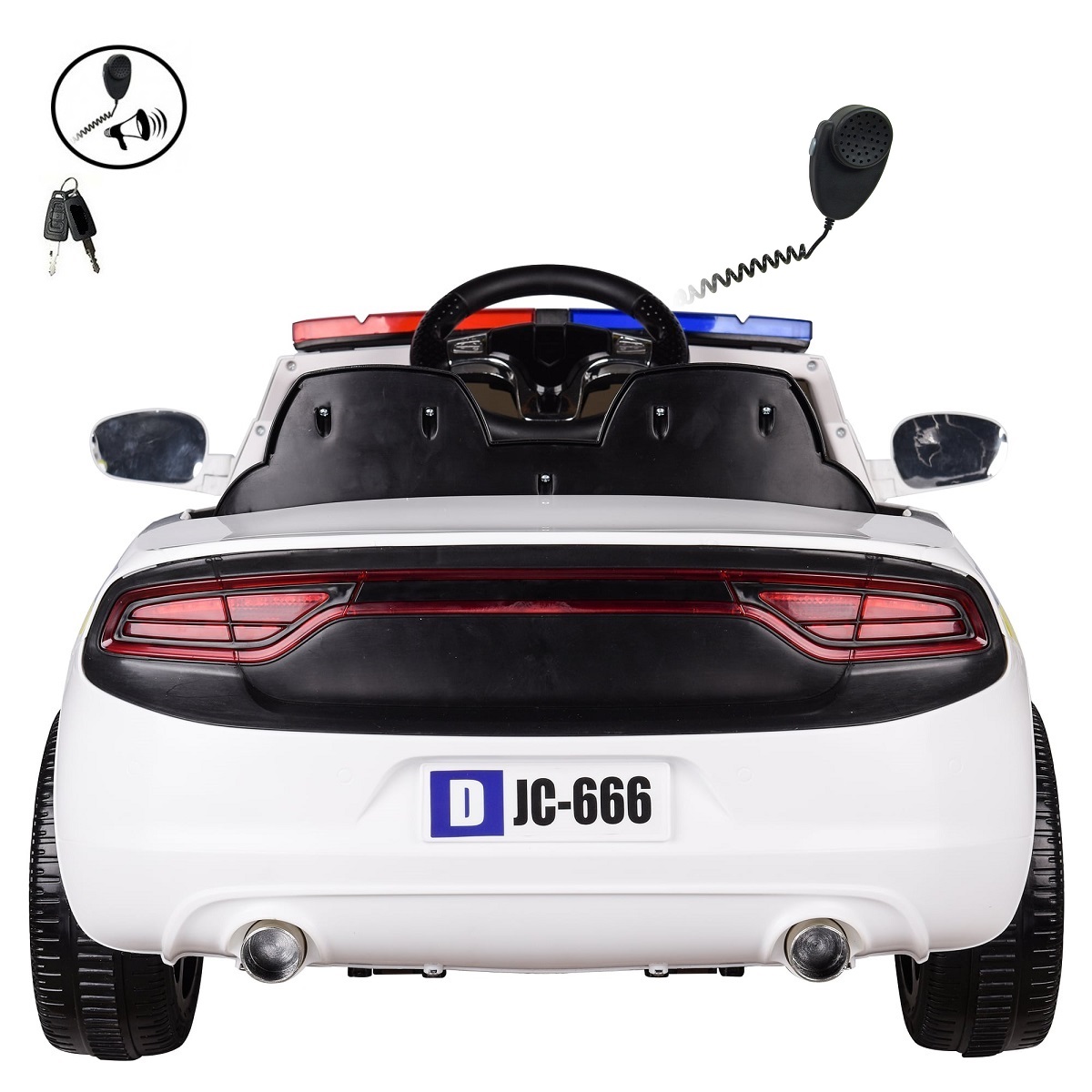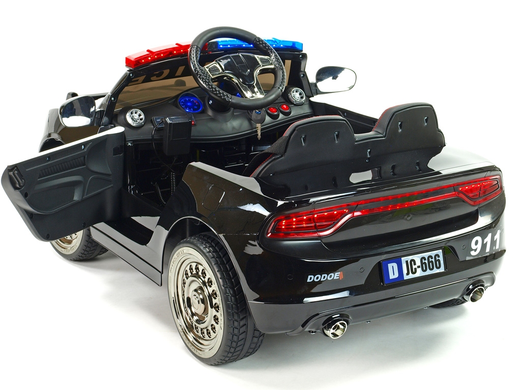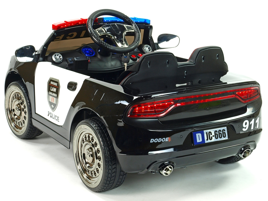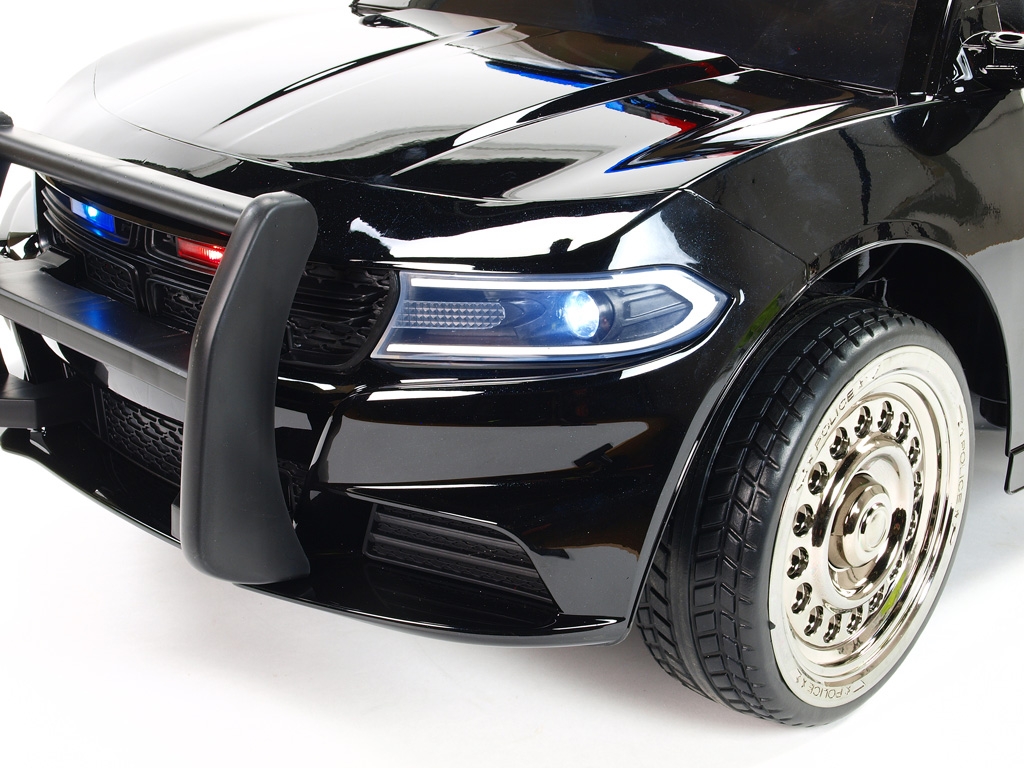 Elektrické policejní auto POLIS je vybaveno 2,4G dálkovým ovládáním, megafonem, policejními LED a zvukovými efekty. Má bílou spínací skříňku, start auta klíčem a přiložen je i 1 náhradní klíč. Obsahuje audio přehrávač, USB a AUX vstup, možnost přehrávání hudby, voltmetr pro stav nabití baterie a zvuky startu motorů, jízdy a klaksonu. Policejní siréna je neodmyslitelnou součástí, stejně jako osvětlení přístrojové desky, policejní majáky a přední a zadní LED světla s možností vypnutí.