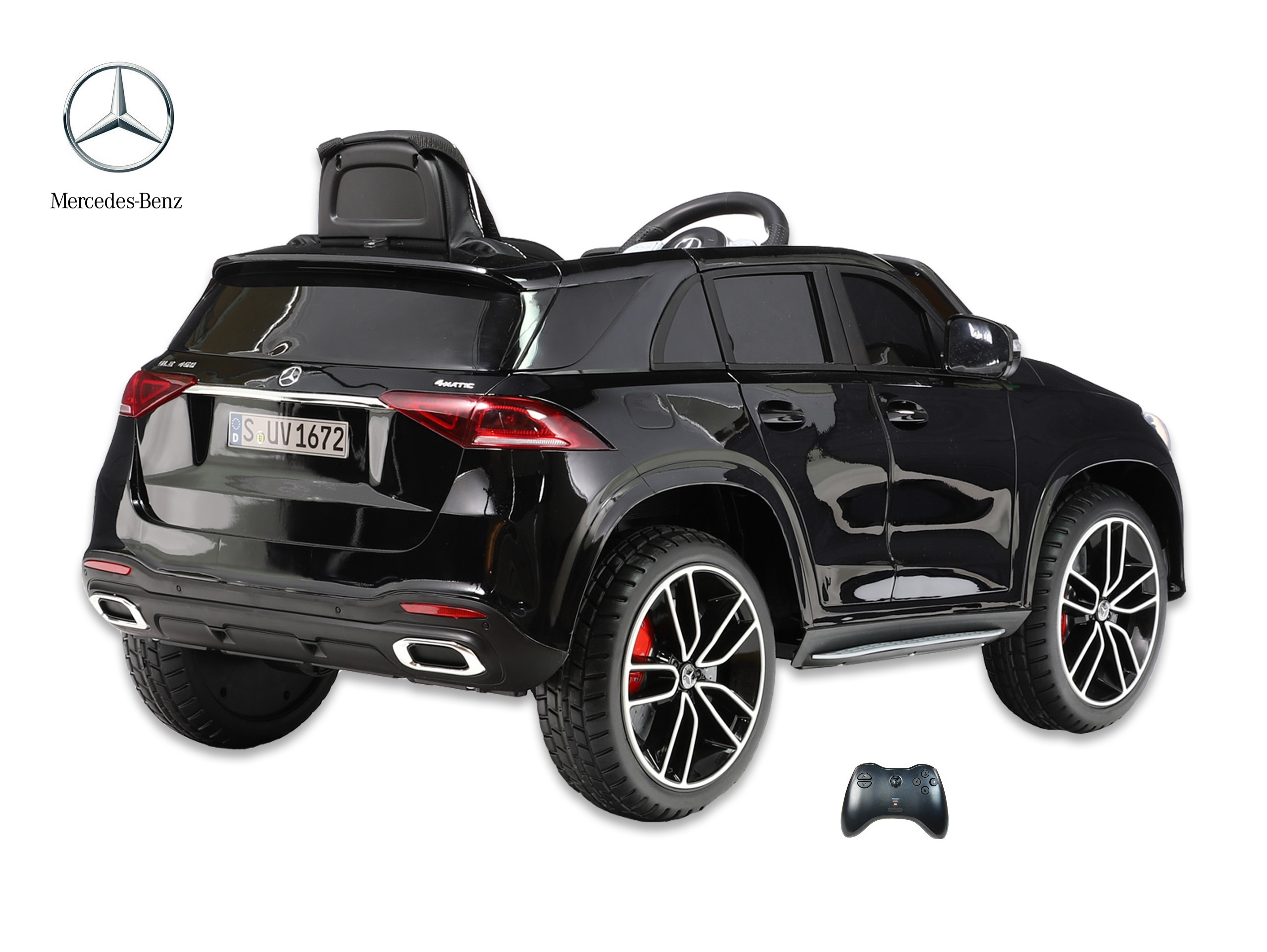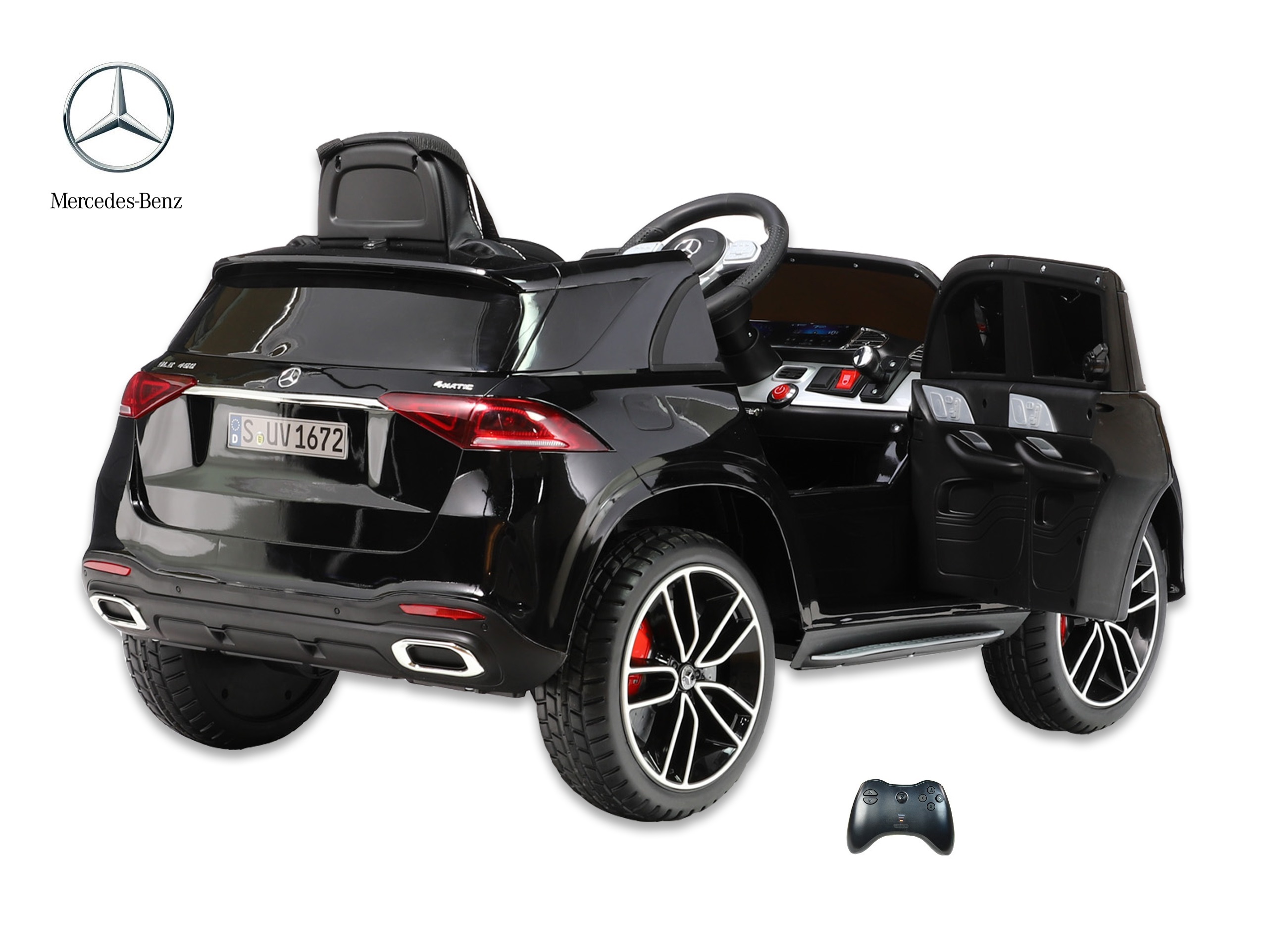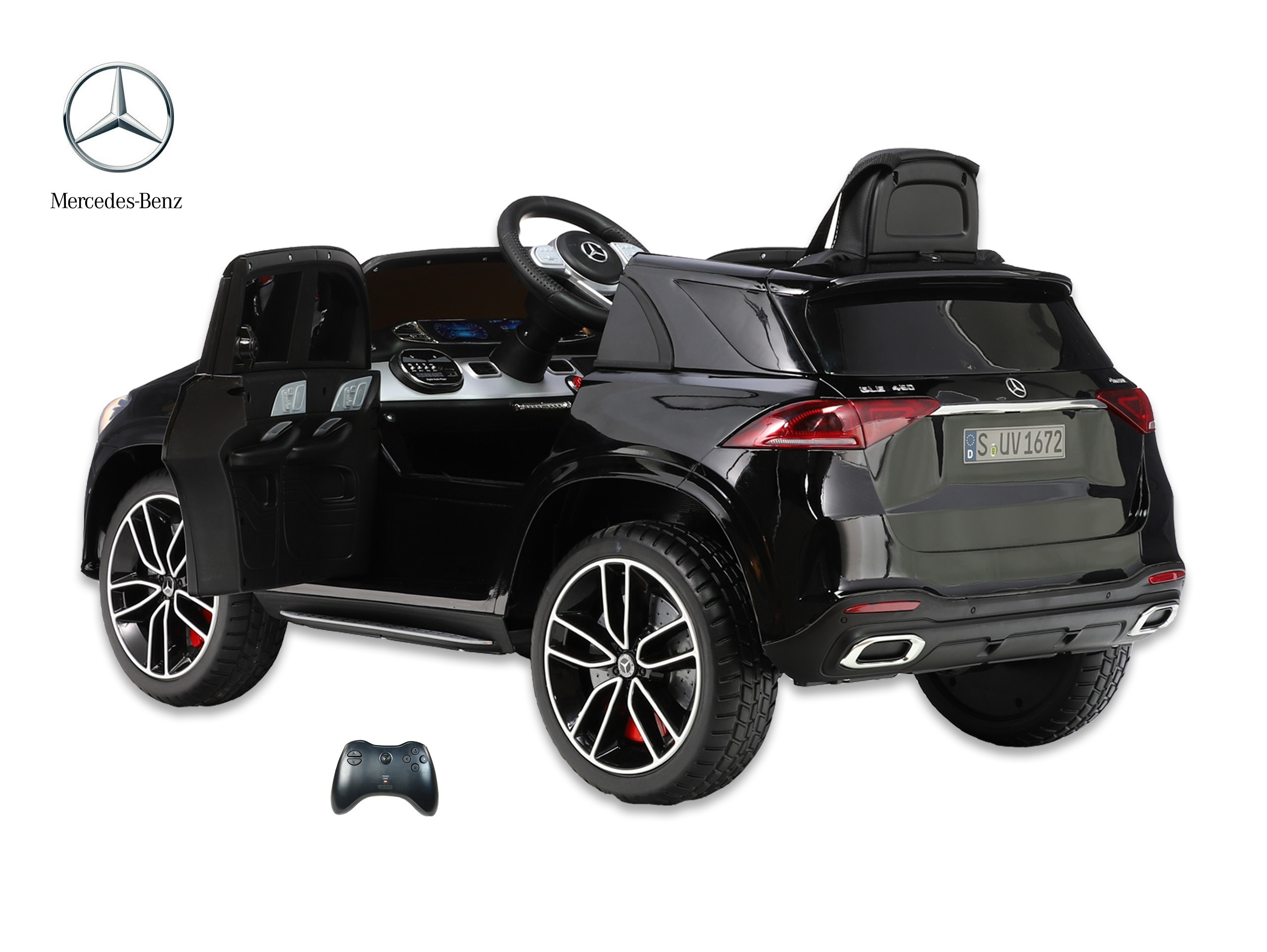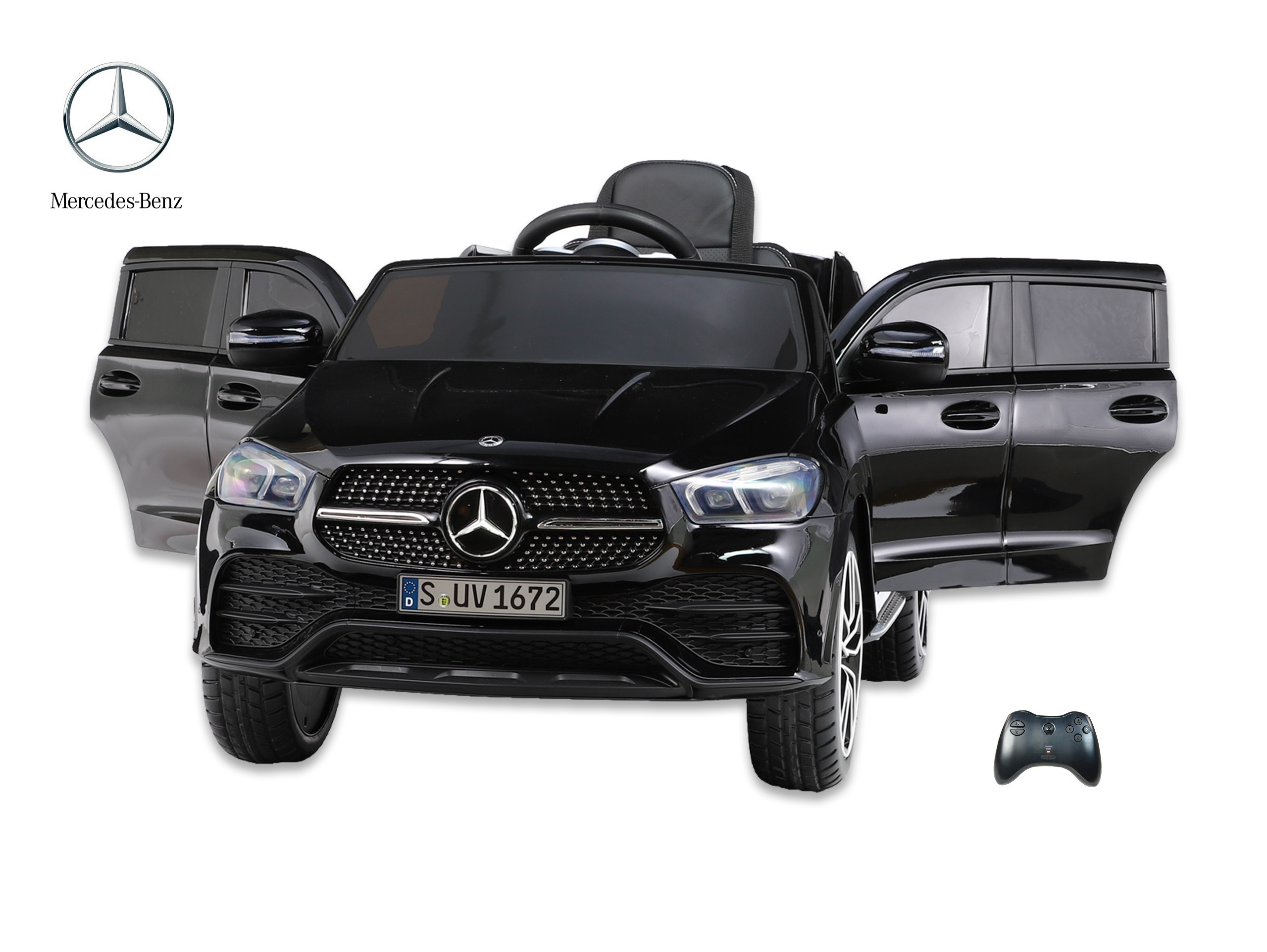 Elektrické SUV Mercedes GLE 450 4matic s 2,4G bluetooth dálkovým ovládáním, jednomístný, USB, TF, voltmetr, LED osvětlení, otvírací dveře, čalouněná sedačka s pásem, EVA kola, výsuvné madlo a kolečka pro ruční tažení, kvalitní materiály a zpracování, originální vzhled, lakovaná barva.