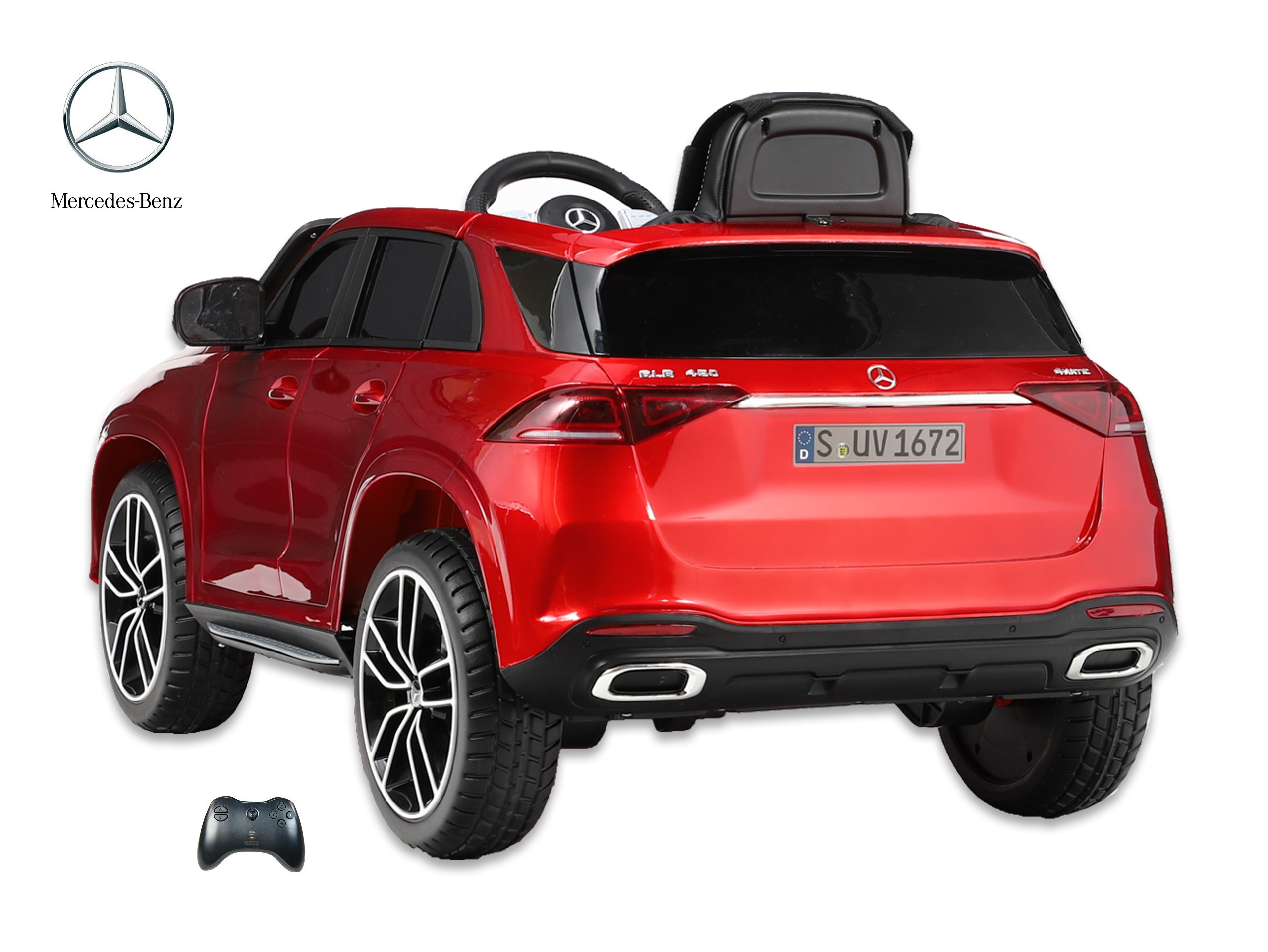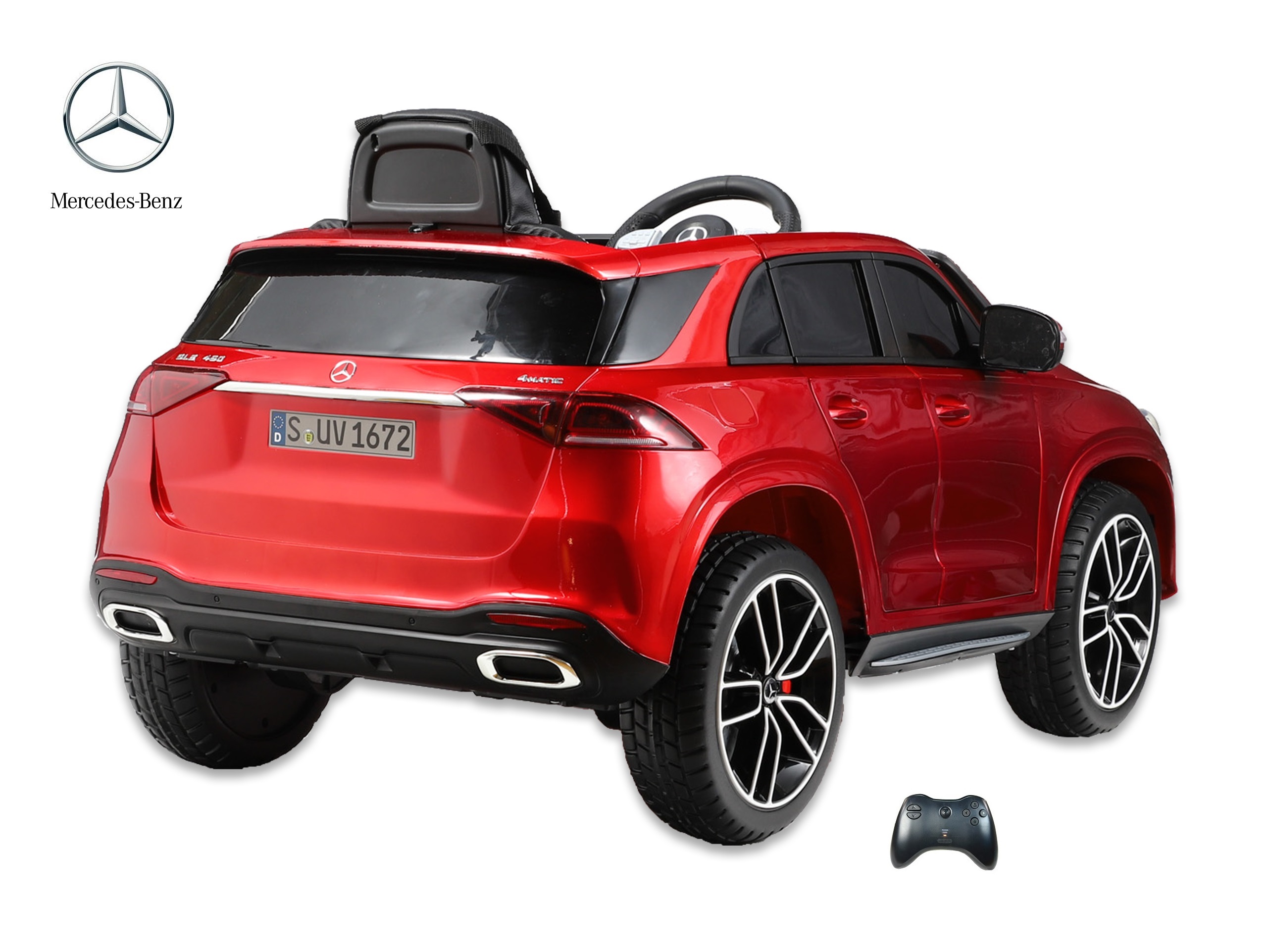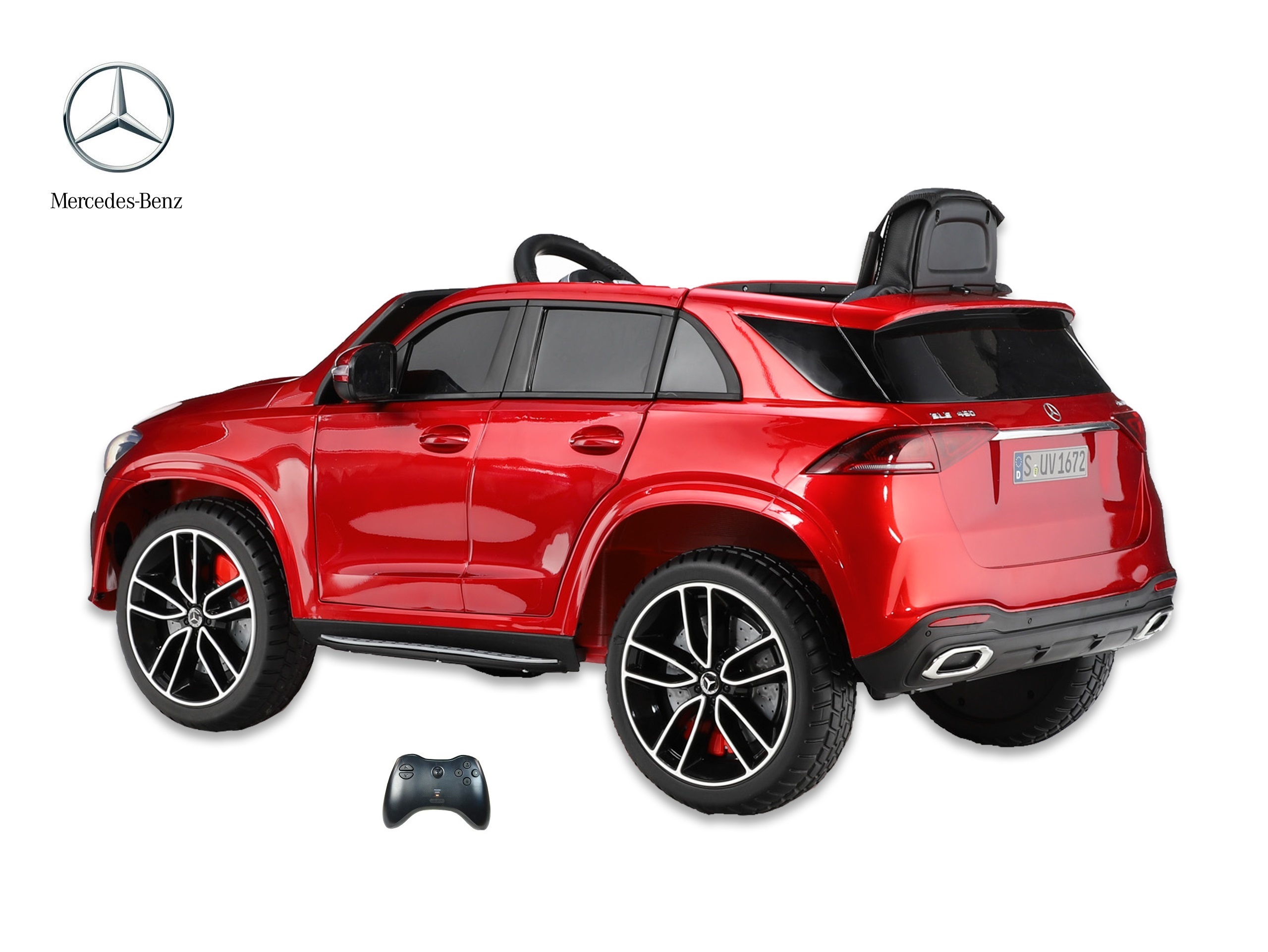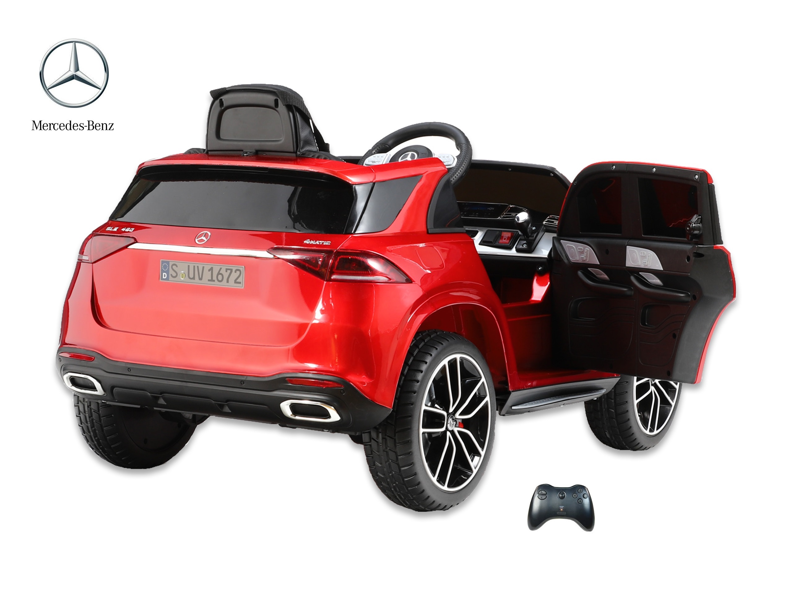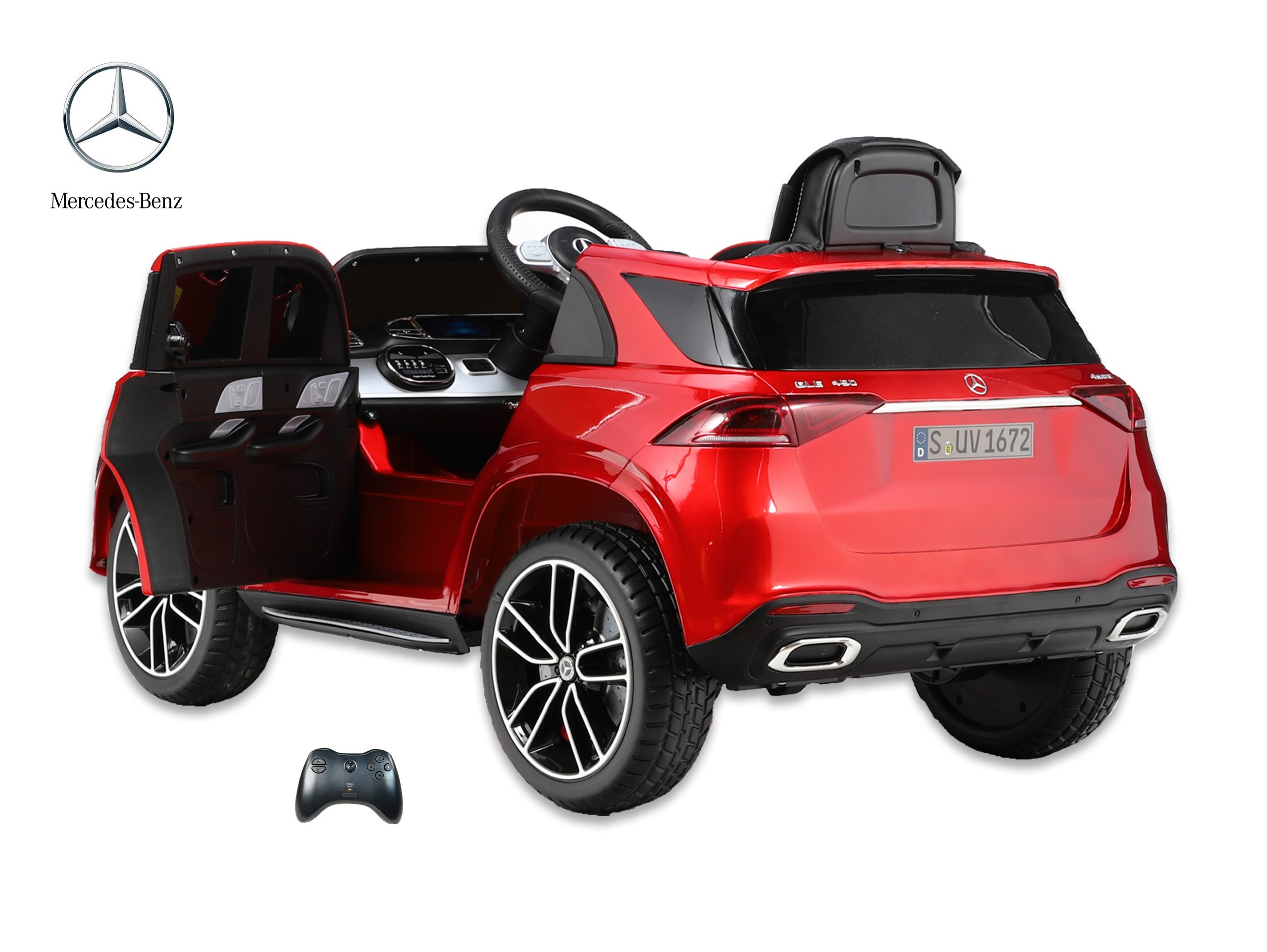 Elektrické SUV Mercedes GLE 450 4matic s 2,4G bluetooth dálkovým ovládáním, jednomístný, USB, TF, voltmetr, LED osvětlení, otvírací dveře, čalouněná sedačka s pásem, EVA kola, výsuvné madlo a kolečka pro ruční tažení, kvalitní materiály a zpracování, originální vzhled, lakovaná barva.
