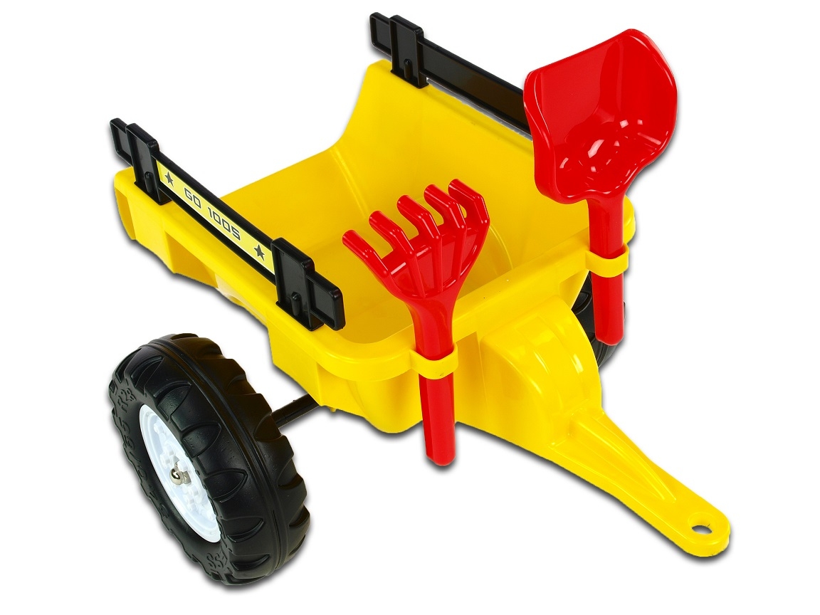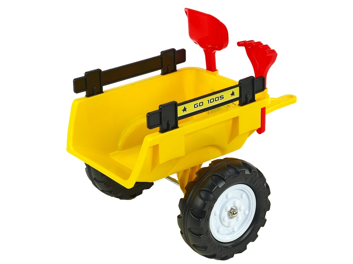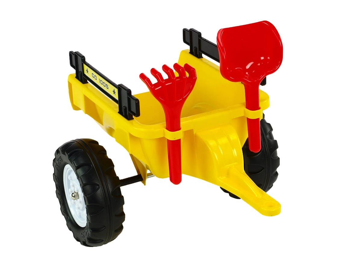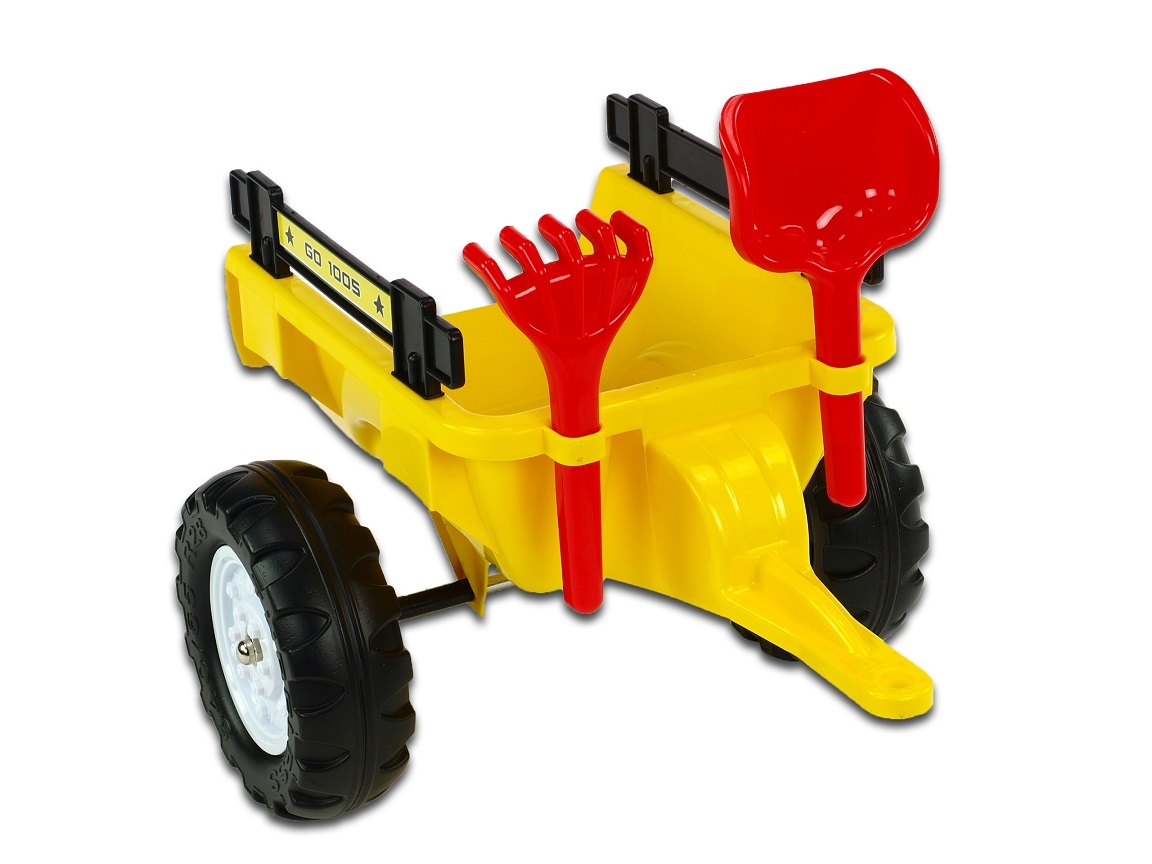 Vlek za traktor Trailer střední s lopatou a hráběmi, 2 kolový, délka 56cm, vyrobeno z kvalitního odolného plastu, perfektní kvalita zpracování a barev, vlek je vhodný k zapojení a tažení námi prodávaných traktorů Kingdom a ZP 12V, prohlédněte obrázky vleků s traktory, délka: 56cm, výška k ohrádce: 33cm, šířka od kol: 41cm průměr kol: 21cm, šířka kol. 7cm, výška oje od země: 18cm, spodku korby: 16cm, ohrádky: 35cm, korba: délka 35cm, výška 13cm, výška s ohrádkou 18cm, šířka 27cm, nosnost: 5kg, určeno pro děti od 3 let, odesíláme v krabici 55 x 28 x 21cm v rozebraném stavu, s návodem k sestavení, při zakoupení vleku s traktorem přiložíme spojovací šroub zdarma,