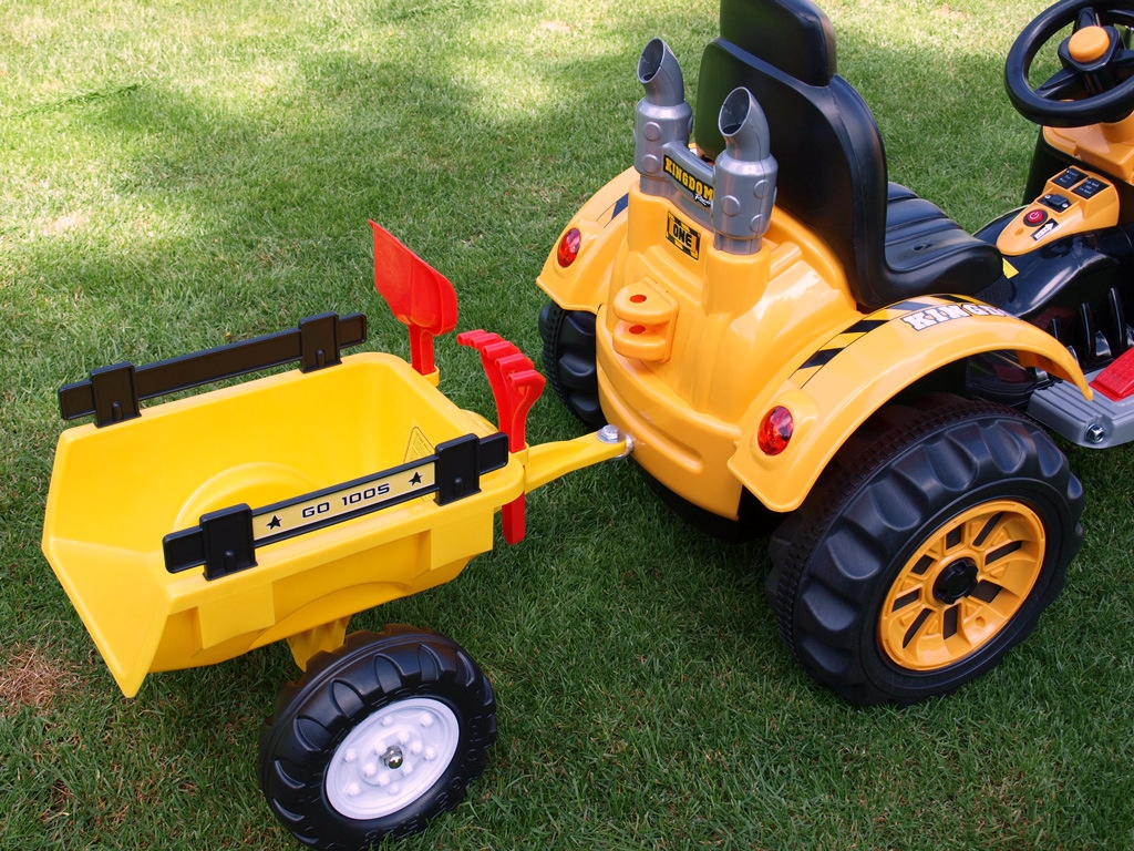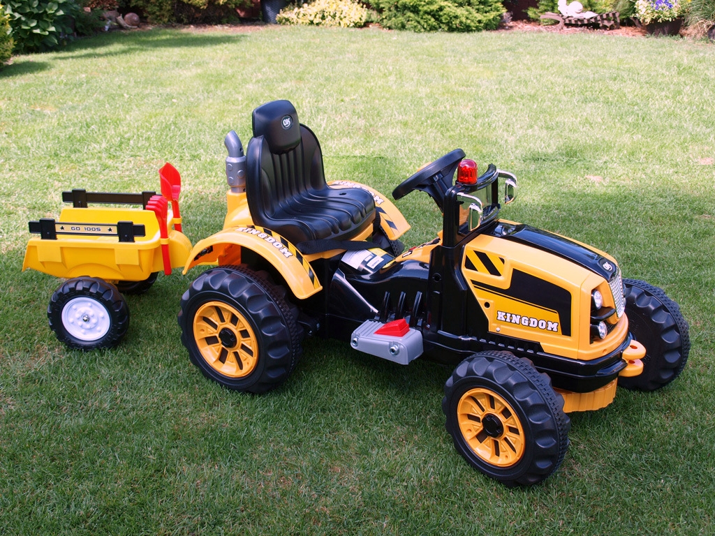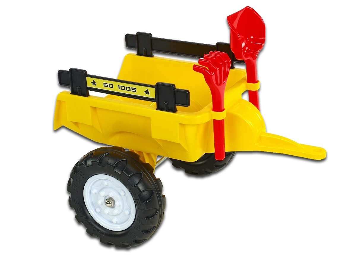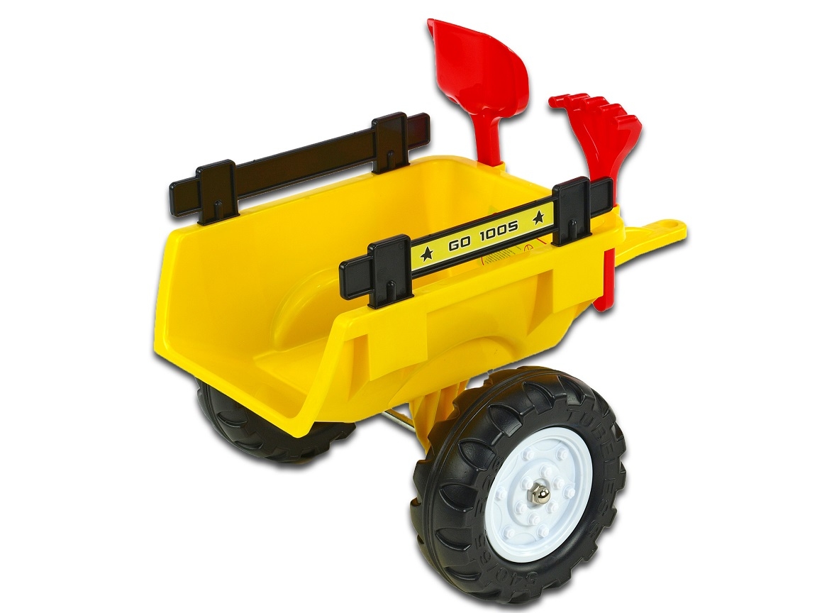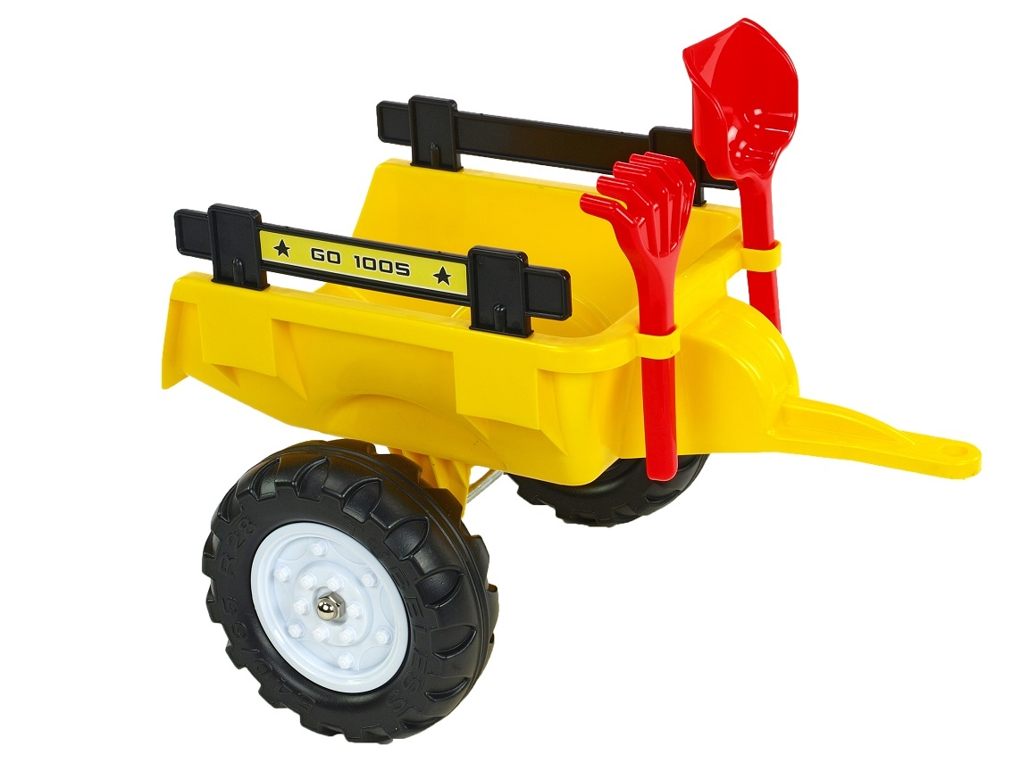 Vlek za traktor Trailer střední s lopatou a hráběmi, 2 kolový, délka 56cm, vyrobeno z kvalitního odolného plastu, perfektní kvalita zpracování a barev, vlek je vhodný k zapojení a tažení námi prodávaných traktorů Kingdom a ZP 12V, prohlédněte obrázky vleků s traktory, délka: 56cm, výška k ohrádce: 33cm, šířka od kol: 41cm průměr kol: 21cm, šířka kol. 7cm, výška oje od země: 18cm, spodku korby: 16cm, ohrádky: 35cm, korba: délka 35cm, výška 13cm, výška s ohrádkou 18cm, šířka 27cm, nosnost: 5kg, určeno pro děti od 3 let, odesíláme v krabici 55 x 28 x 21cm v rozebraném stavu, s návodem k sestavení, při zakoupení vleku s traktorem přiložíme spojovací šroub zdarma,